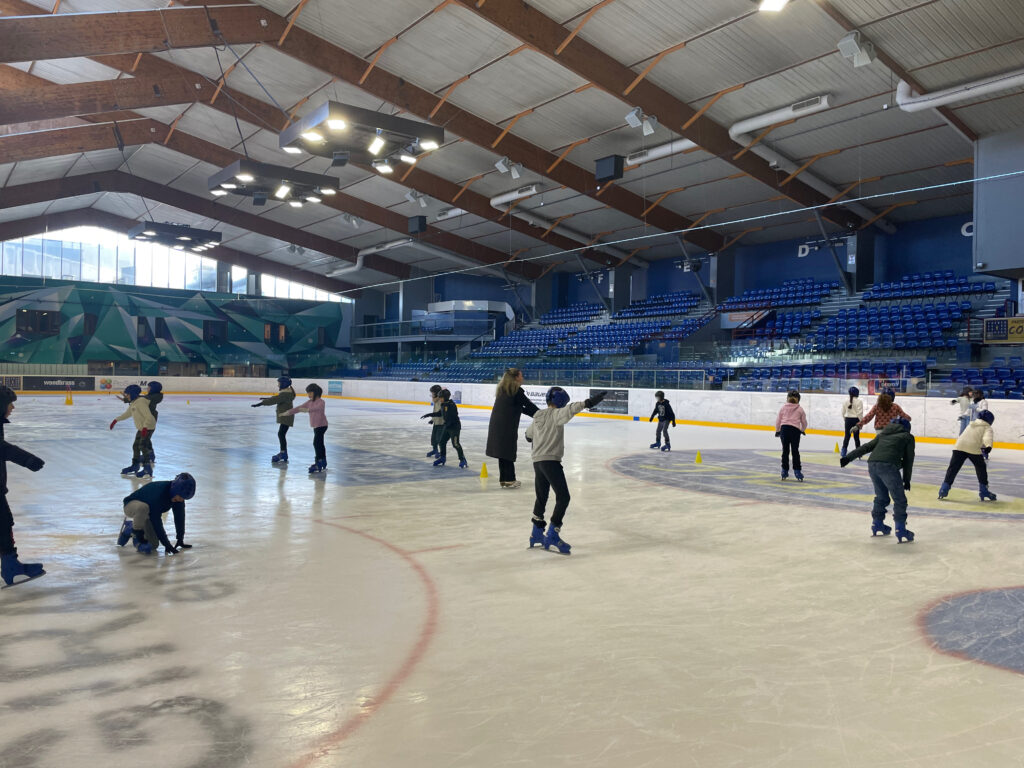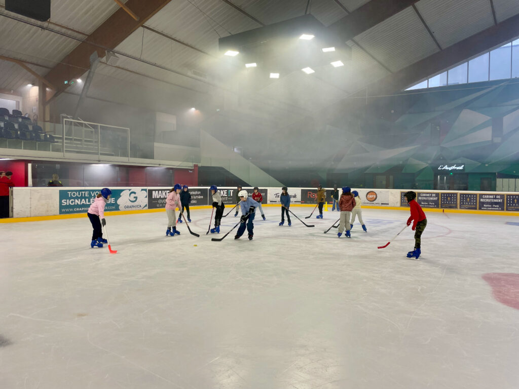Tous les mardis matin, la classe se rendait à la patinoire. Les élèves ont réalisé différents exercices pour gagner en assurance sur la glace avant de participer à des matchs de hockey.